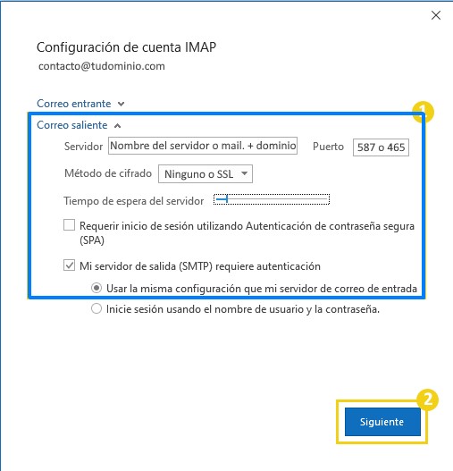 En la pestaña Correo Saliente realice los siguientes ajustes y después haga clic en Siguiente: