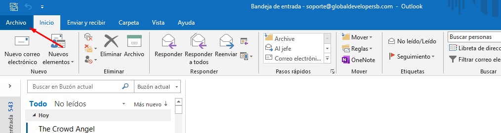 Deberá ir a panel de herramientas de Outlook y darle Clic en la opción Archivo.