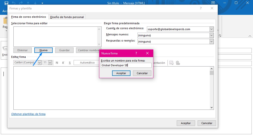 Una vez dentro dar clic en la opción Nueva e Escribir un nombre para tener ordenado de sus firmas.