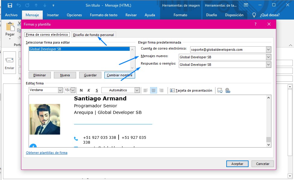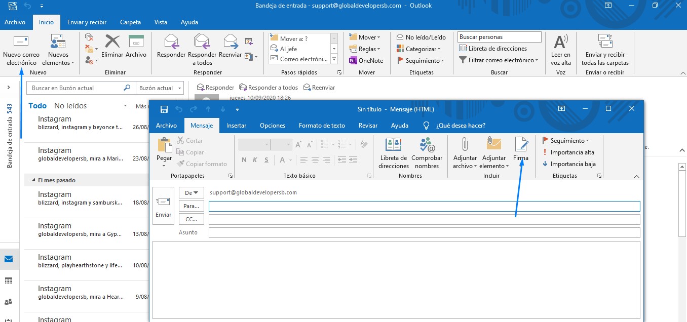 Ir a la opción nuevo mensaje -> se le abrira una ventana donde el cual desde Mensaje - podrás ver la opción Firma.