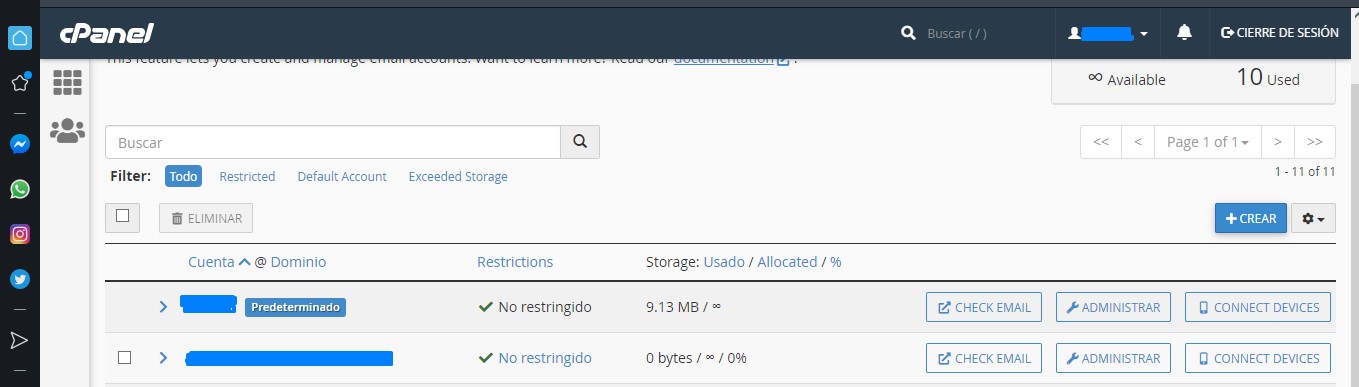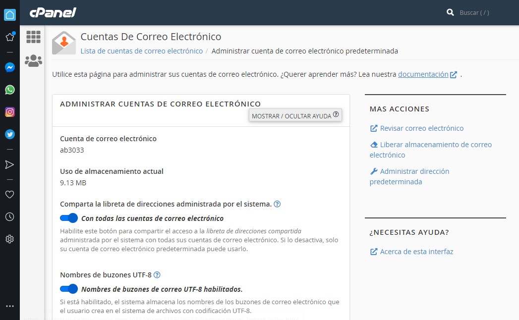 Esta opción sirve para administrar sus cuentas de correo electrónico donde el cuál podrá redireccionar, desabilitar configurar el correo, crear carpetas automaticas y direcciones plus..