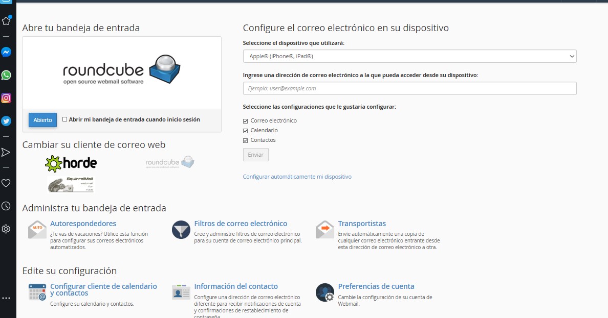 La opción Check Email sirve para administrar, acceder a tu bandeja de entrada desde Roundcube - Horde y otros. Tambien podra configurar mensajes Autorespondedores, filtros, configuración de calendario, clientes, spam, BoxTrapper y configurar su correo a cualquier dispositivo.